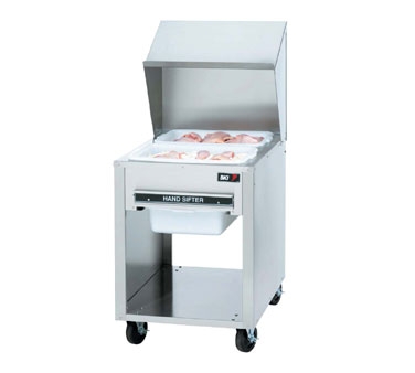 Breading Work Table, sifter drawer w/lower receiving pan, removable & reversible hinged side shelf for 18"x26" pan, (2) plastic (15" x 20" x 5") pans, lug shelf, stainless steel construction, 4 locking casters, UL (BKI)